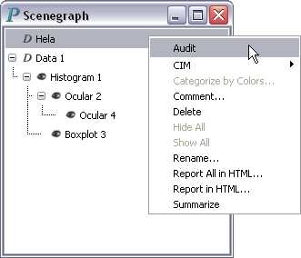 Once auditing has been turned on, the audited data set, its plots, and its nonmodal dialogs generated during the course of auditing will be printed in red in the scenegraph, as illustrated by Figure 7-1.