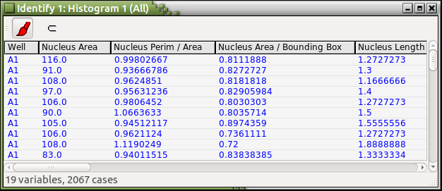 There is an invisible rectangle, the hot spot, in front of the pointing finger. When the left mouse button is pressed, any icons pointed at by the finger will be highlighted in the current identifying color, which is always displayed on the mode icon and the mode cursor. You may move the hand cursor around while the mouse button is being held down; icons leaving the identifying hot spot will resume their previous colors. Right after the mouse button is released, all variable values of the observations represented by any icons last pointed at by the finger will be listed in a list view dialog such as